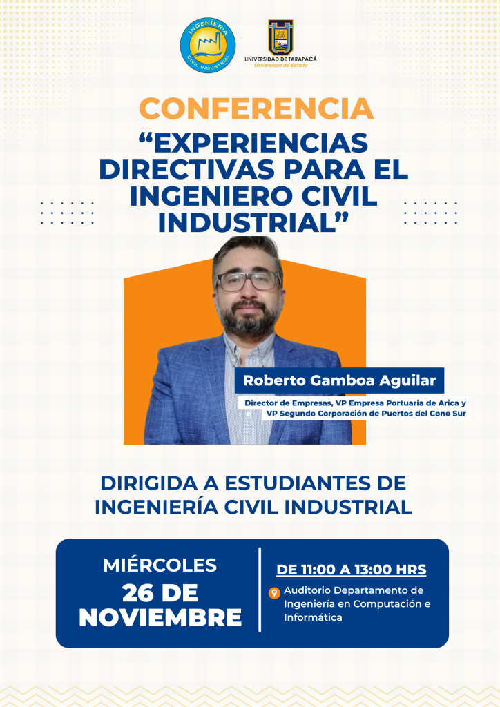 La Escuela de Ingeniería Civil Industrial tiene el agrado de invitarles a la conferencia “Experiencias Directivas para el Ingeniero Civil Industrial”, dictada por Roberto Gamboa Aguilar, destacado profesional con una sólida trayectoria académica y directiva.